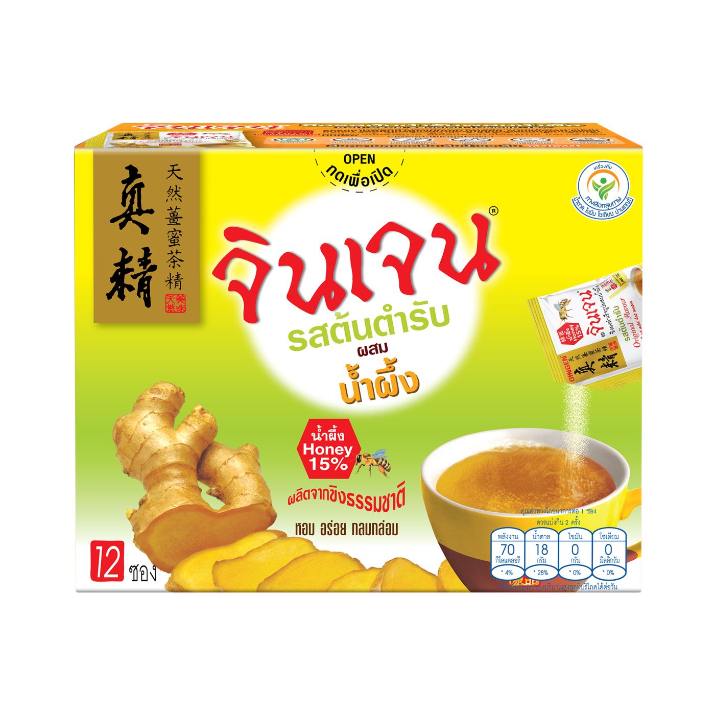 ละลายทันที ไม่มีกาก สะดวก ดื่มได้ทุกโอกาส สดชื่น อร่อย จากขิงแท้และน้ำผึ้งตามธรรมชาติ ไม่มีสารสังเคราะห์ผลิตด้วยเทคโนโลยีที่ทันสมัย ควบคุมโดยผู้เชี่ยวชาญจึงรักษา กลิ่น รส และคุณภาพตามธรรมชาติ